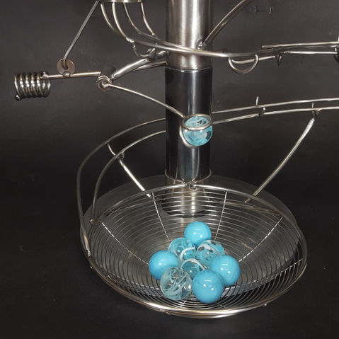 Frost is a fantastic, human-powered kinetic art, Rolling Ball Sculpture that runs and runs. It practically implores the viewer to reload the marbles before they run out. As with many of these Rolling Ball Sculptures, it mesmerizes - the motion and sound of the continuous falling of the marbles have a real meditative quality about them.