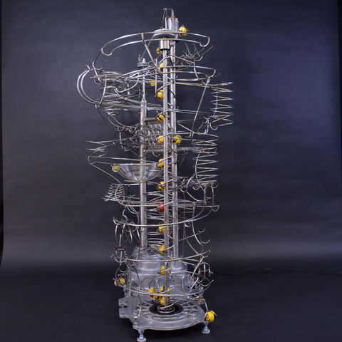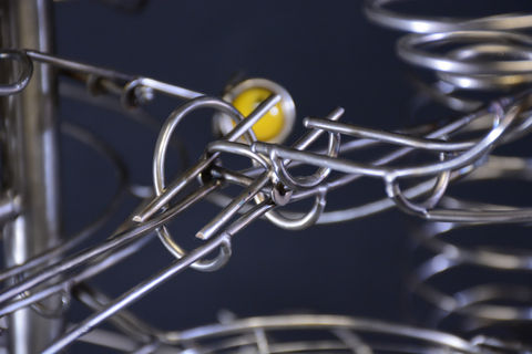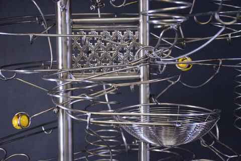 Oiled, Rolling Ball Sculpture, runs like a well-oiled machine. There's something old-looking about it but, then again, there's a lot that looks new. Sometimes it's quiet, with no marbles running, and sometimes, 3 or 4 are running at the same time on different tracks. There's lots of moving parts here to catch your eye and keep your attention - a number of intriguing spirals, a loop, switches and 2 different lifts.